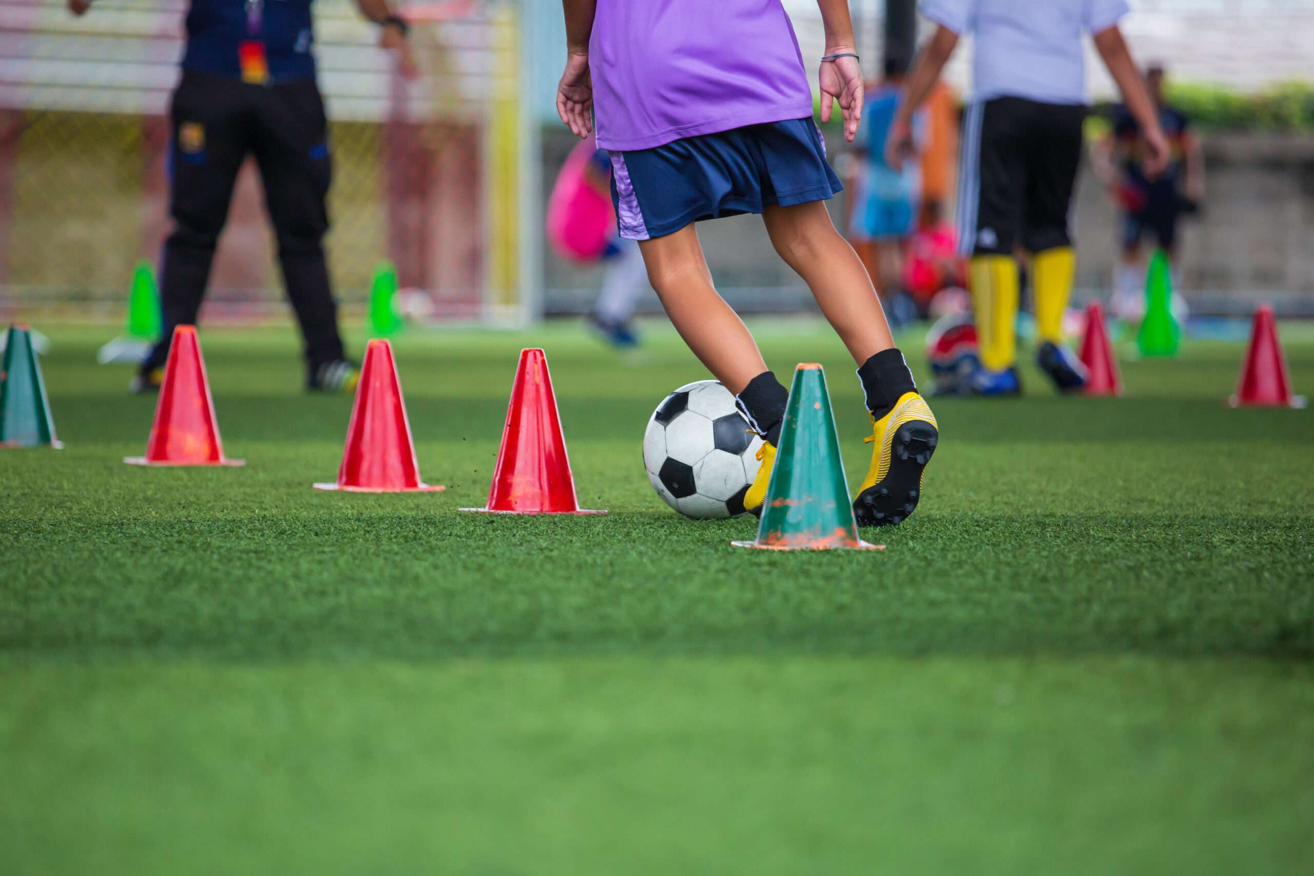 Children playing control soccer ball tactics cone on grass field with for training background Training children in Soccer